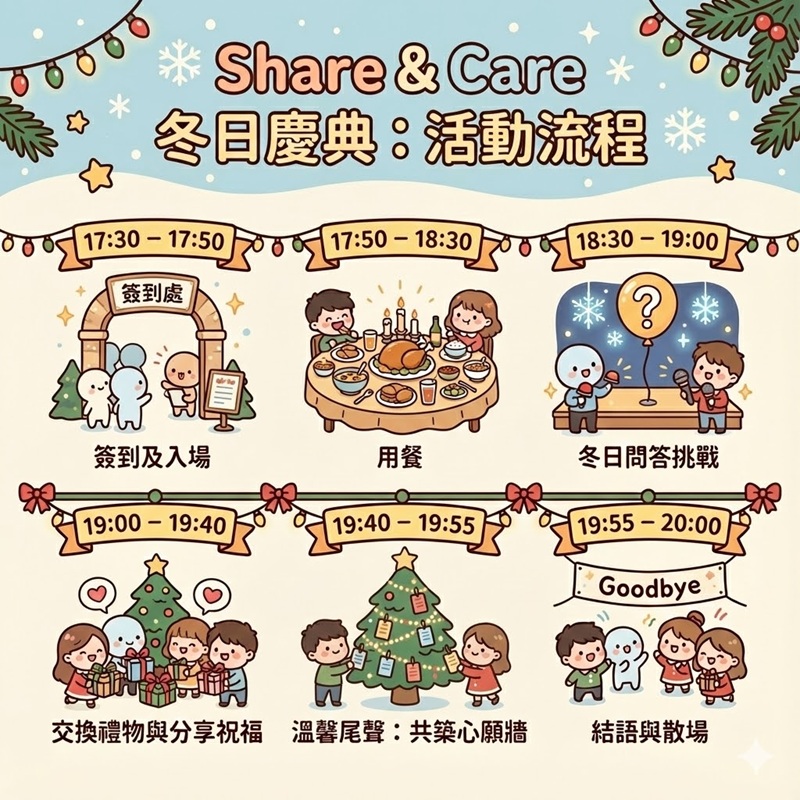 這是一個充滿溫暖的夜晚,我們準備了豐盛的晚餐、有趣的互動遊戲,還有最令人期待的交換禮物環節。一起度過難忘的聖誕夜!