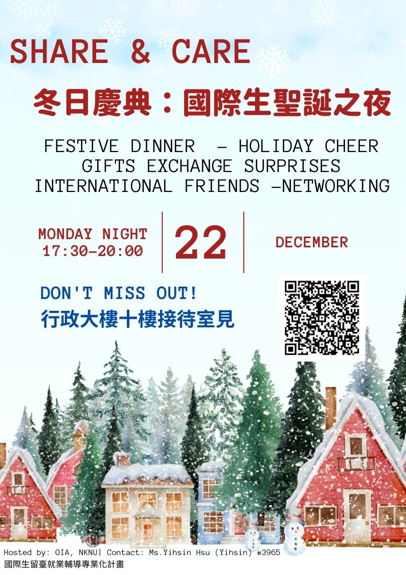 Christmas is around the corner! The Office of International Affairs (OIA) cordially invites you to the "Share & Care Winter Festival." Join us for a festive dinner, fun games, and the exciting gift exchange session. Let's share the warmth of the holiday season!